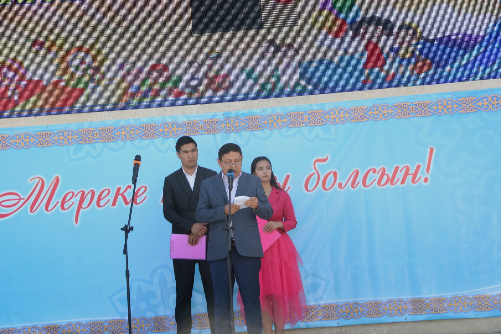 Бұдан кейін сахна төрінде мектеп, балабақша, қосымша білім беру мектептерінің өнерпаздары әсем әндерін шырқап, мың бұрала би биледі.
